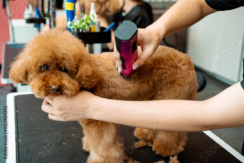 Professional grooming service to prevent fur matting. Cute fluffy malltipoo is waiting patiently while groomer is trimming dog hair to make pet feel cooler.
