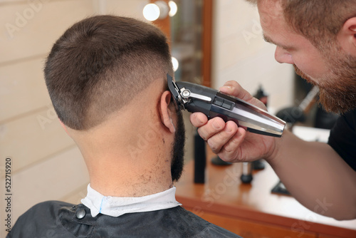 Professional hairdresser working with client in barbershop, closeup