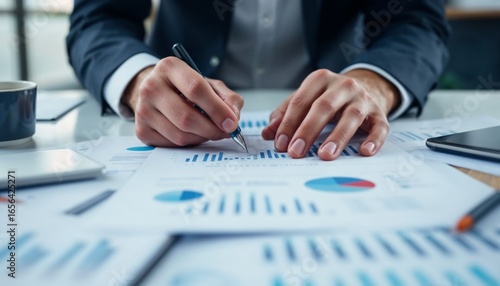 Professional Hands Arranging Documents and Charts on an Office Desk for an Organized Workplace Environment