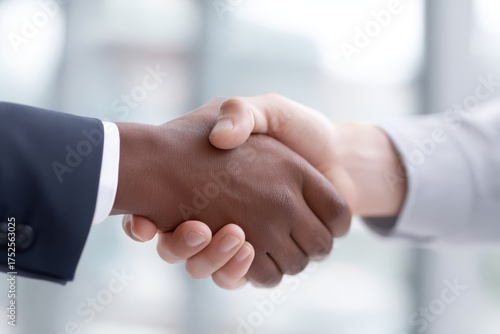Professional handshake between diverse businesspeople closing successful deal in modern office with glass windows for business partnership collaboration and professional success achievement concept.