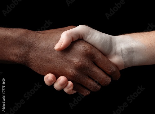 Professional handshake between two people of diverse backgrounds, symbolizing agreement, partnership, and unity against a dark backdrop