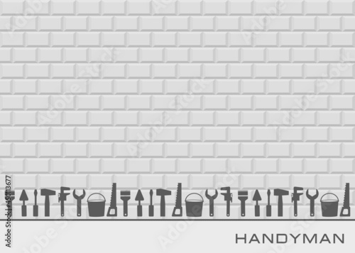 Professional handyman services. Vector banner template with tools collection and text space on gray. Set of repair tools on brick wall background for your web site design, app, UI. EPS10.