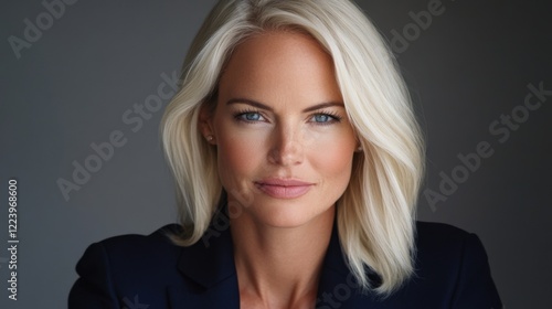 Professional Headshot of a Confident Businesswoman Wearing a Blazer Against a Plain Gray Background with Bright Lighting