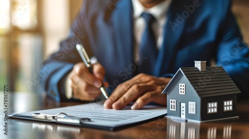 Professional in suit finalizes real estate deal, small model house on table. Document signing concept with clarity and focus on the foreground. Real estate transaction completed. AI