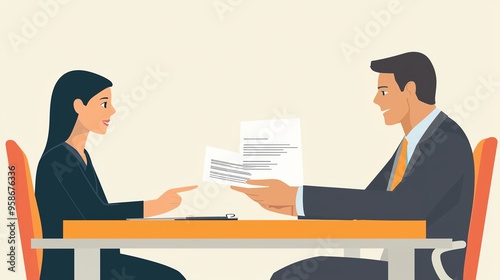 Professional interaction between a man and a woman at a table, exchanging documents in a business setting.