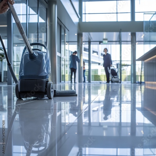 Professional janitorial cart fully equipped for cleaning in a bright spacious facility ensuring hygiene, Office floor cleaning service professional cleaning floor with blurred office background