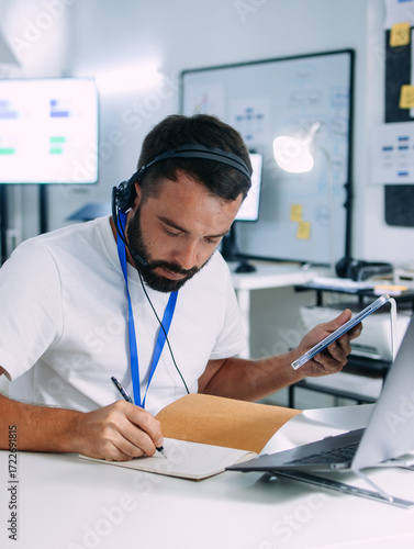 Professional Male Call Center Agent Wearing Headset Using Computer for Customer Service, Business Consulting, Customer Assistance, and Remote Technical Service and Online Consulting at Office Desk.