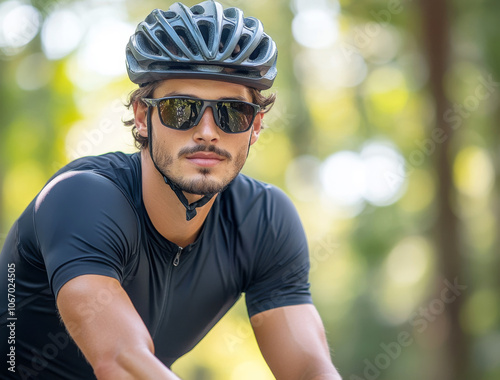 Professional male cyclist in sports gear riding a racing bike on a park road