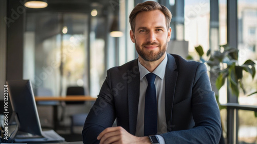 Professional male marketing executive in modern office setting, exuding confidence and approachability. bright environment enhances professional atmosphere