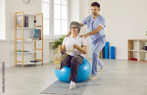 Professional male physiotherapist works with senior female patient in rehabilitation center. Smiling elderly woman sitting on fitness ball in medical office and doing exercises with resistant band.
