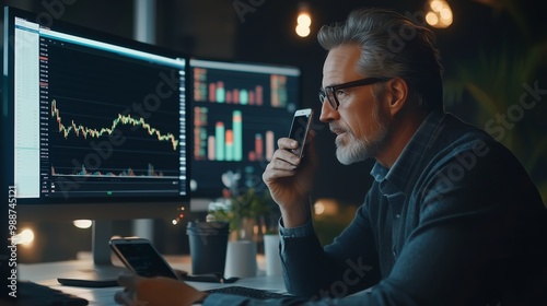 Professional man analyzing market trends with multiple screens in an evening workspace
