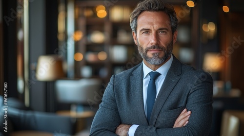 Professional man in a business suit stands confidently in a stylish hotel lobby during a sunny afternoon