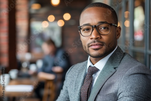Professional man in a suit and glasses poses confidently in a modern cafe during a business meeting