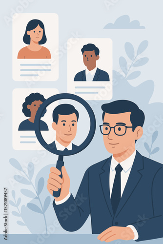 Professional Man Recruiting Candidates with Magnifying Glass, Human Resources Manager Searching for New Employee, Job Application Review, Hiring Process, Business Recruitment Concept