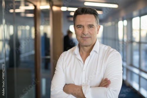Professional man, white shirt, confident pose, arms crossed, office hallway, glass walls, business environment, soft lighting, mature executive, greying hair, clean-cut appearance, serious expression,