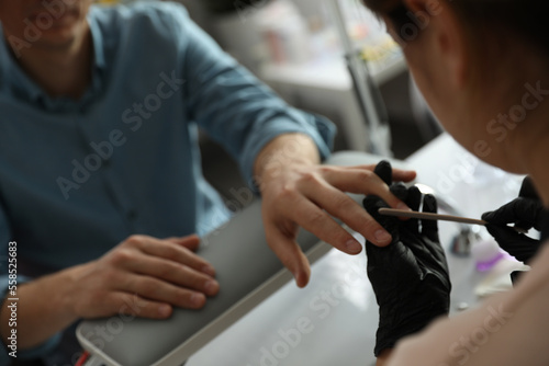Professional manicurist filing client's nails in beauty salon, closeup
