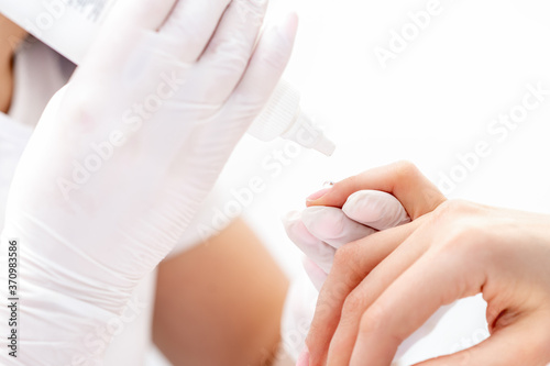 Professional manicurist pouring oil on nails manicure of woman in beauty salon.