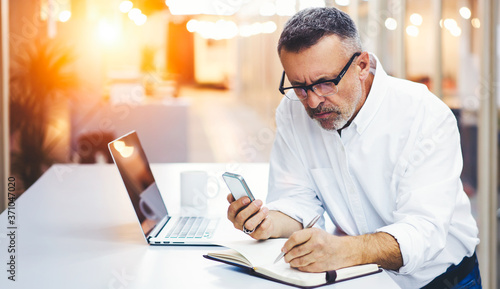 Professional marketing expert in stylish optical writing information in notepad making research via smartphone.Prosperous male entrepreneur noting contact of banking service standing in office