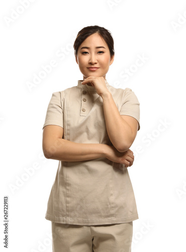 Professional masseuse in spa uniform on white background