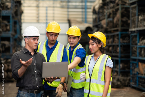 Professional Mechanical Engineer team Working on Personal Computer at Second-hand spare parts of old car parts warehouse store.