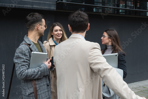 Professional occupation, office workers. Business people meet before staff meeting and presentation in office building, to talk and discus plans and tactic of speech theme. Finance and economy.