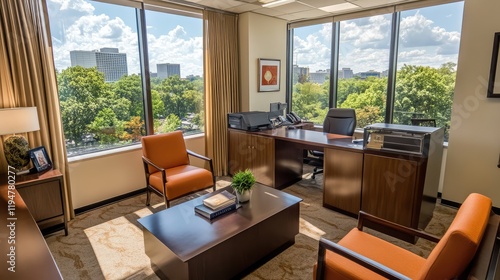 Professional office design featuring clean lines, ergonomic furniture, and large windows overlooking a cityscape. Bright, modern, and inviting.