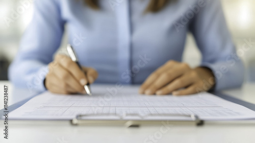 professional office scene featuring person writing on document with pen, showcasing focus and productivity. setting emphasizes work environment