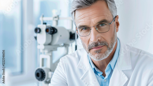 professional ophthalmologist wearing glasses and white coat is standing confidently in modern clinic, with advanced eye examination equipment visible in background