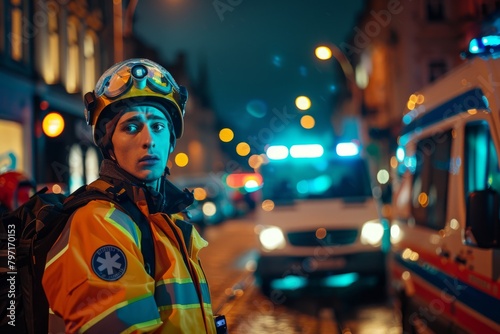 Professional paramedic doctor ambulance rescue service person help accident quick assistance emergency health care specialist standing female medic hospital nurse experienced urgent vehicle