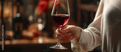 Professional photo about a hand of woman holding the handle of a glass containing red wine