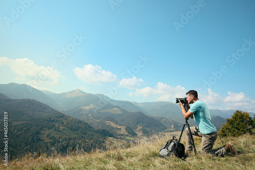 Professional photographer taking picture with modern camera in mountains. Space for text