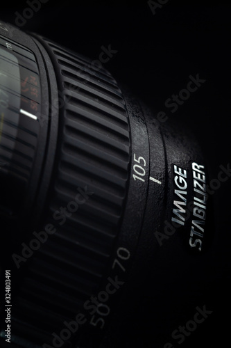Professional photographic lens 24-105 mm polarizing filter for modern DSLR camera, PRO series image stabilization. Close-up macro shot of