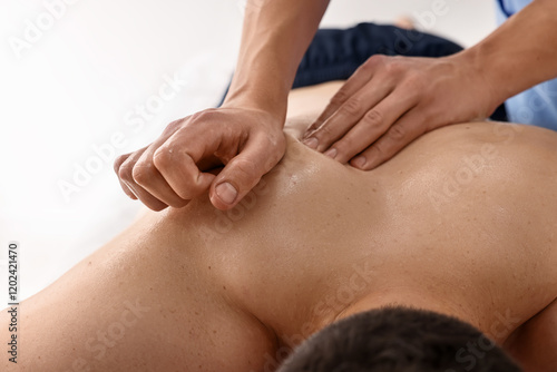 Professional physiotherapist doing back massage for his client indoors, closeup