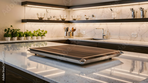 Professional portrait of an Ultra-Modern Kitchen with a cutting board in focus, shelves with lamps and stainless steel utensils. Gastronomy and architecture concept.