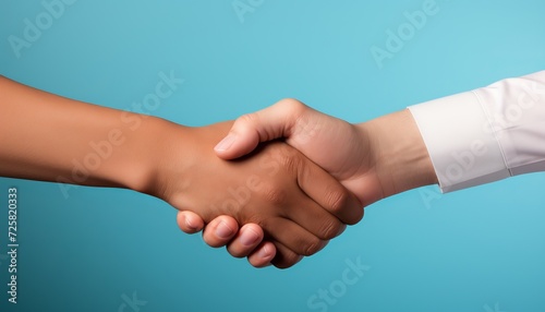 Professional promotional handshake on vibrant blue background with ample space for customizable text