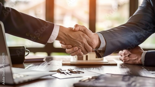 Professional real estate agent confidently shaking hands with a satisfied client over a desk with a house model and keys.real estate closing handshake,successful property deal