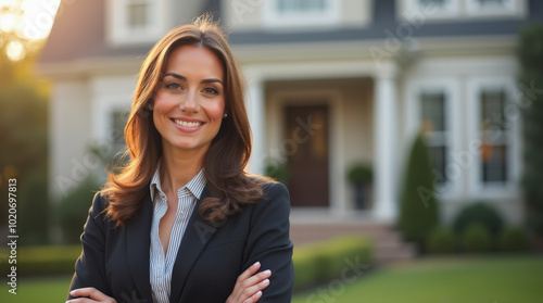 Professional Real Estate Agent Portrait of Confident Female Realtor in Front of Luxury Home for Real Estate Marketing