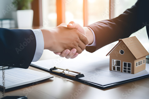 Professional real estate agent shaking hands with client after signing home purchase contract in real estate agency office