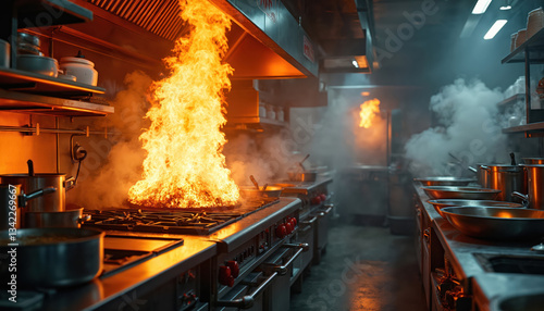 Professional restaurant kitchen fire. Flames rise from stove, smoke fills room. Food service industry faces work accident, safety hazard, insurance claim after domestic burn disaster.