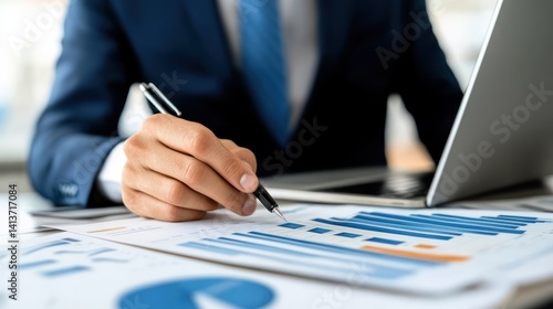 professional scrutinizing performance charts in a corporate setting with a pen in hand near a laptop displays strategic analysis
