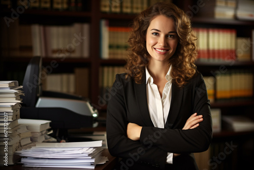 Professional secretary standing at desk with paperwork stacked. Document and paperwork concept. Secretary work. Smiling young woman working in a business office. Lawyer office.