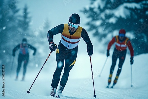 Professional skier competing in cross-country race during snowfall