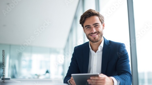 Professional smiling businessman in formal suit working with tablet in bright modern office.