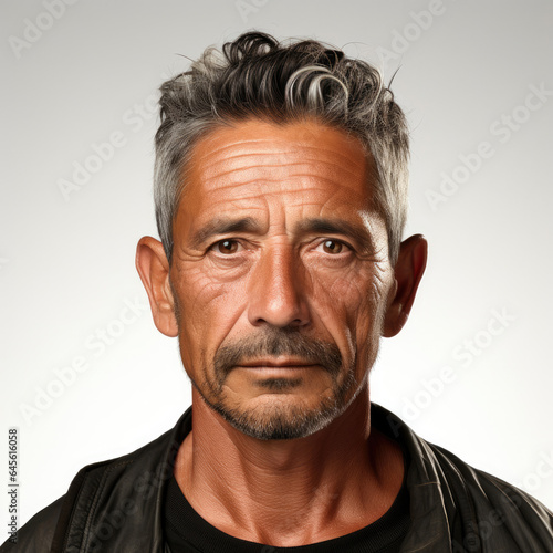 Professional studio head shot of an astounded 65-year-old Latino boy, eyes looking right.