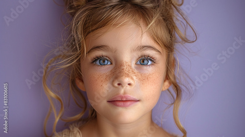 Professional studio photo portrait of a cute little girl, lovely kid with naive face, adorable baby, a child with a emotional expression, widescreen 16:9