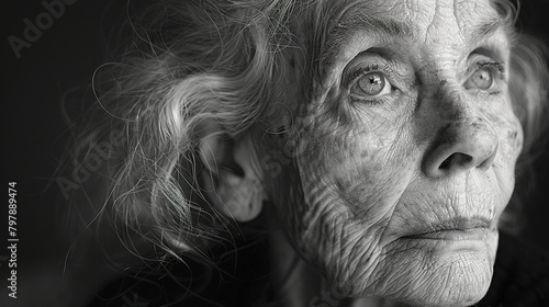 Professional studio photo portrait of a nice pleasant elderly woman, senior, a retiree, with a pronounced emotional expression, widescreen 16:9