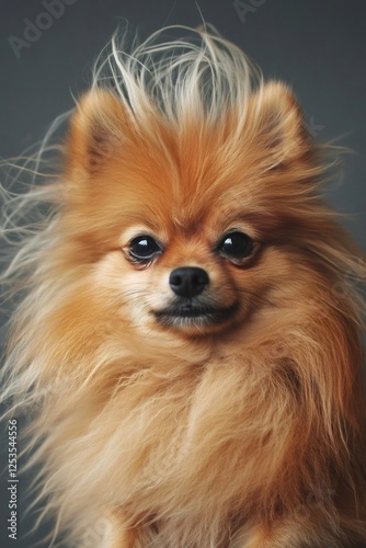 Professional studio portrait of fluffy pomeranian dog sitting calmly on gray backdrop, highlighting soft fur and charming personality