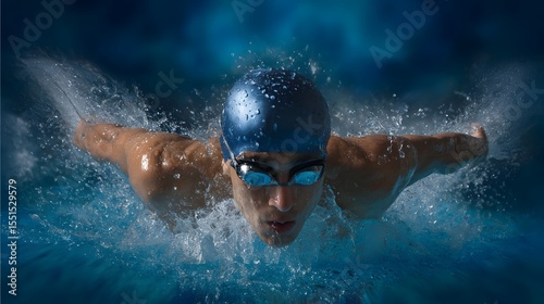 Professional swimmer in goggles and swim cap captured mid motion while powerfully executing the dynamic butterfly stroke creating a dramatic splash in the water