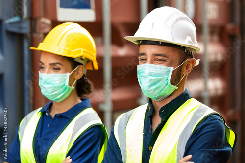 professional team man and woman worker wearing protection face mask during coronavirus and flu outbreak and wearing safety hardhat helmet at container yard or cargo warehouse