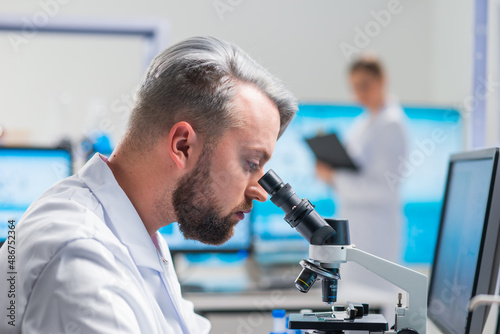 Professional team of scientists is working on a vaccine in a modern scientific research laboratory. Genetic engineer workplace. Future technology and science.